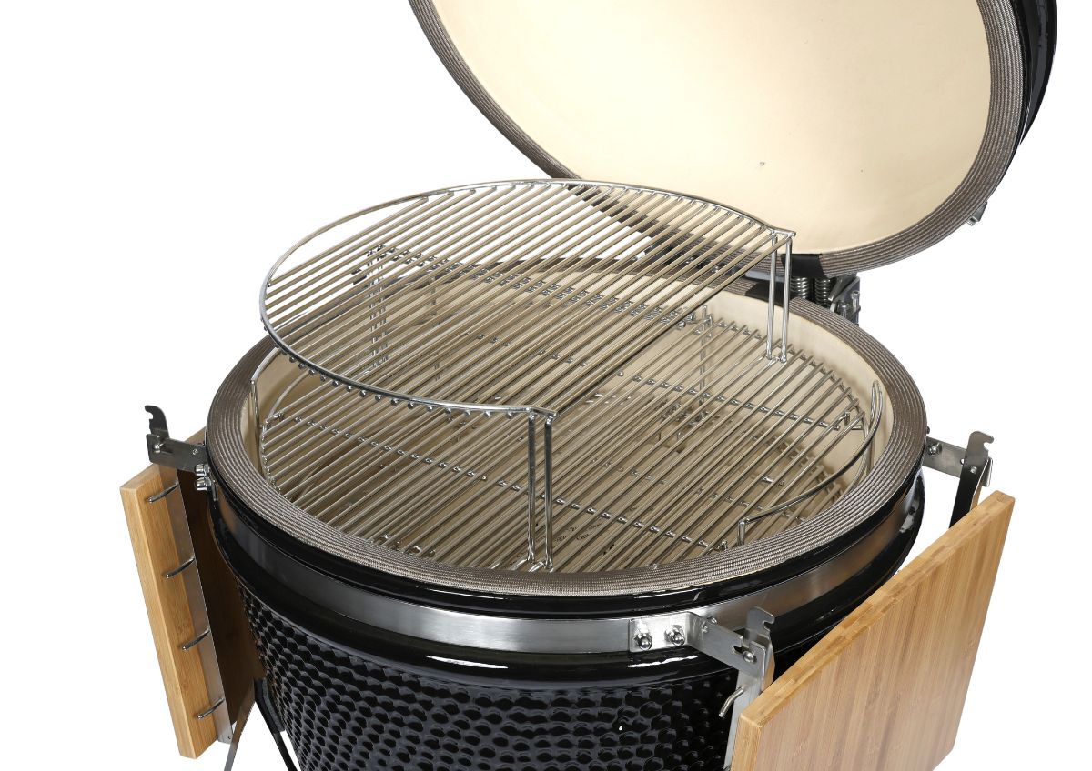 Erreicht bis zu 400 °C. Die 3 cm dicke Keramikwand und die Dichtung mit Metallfasern sorgen für herausragende Leistung. Mit zweistufigem und zusätzlichem Erhöhungsrost ausgestattet. Ein geteilter Kohlekorb gewährleistet ideale Luftzirkulation.