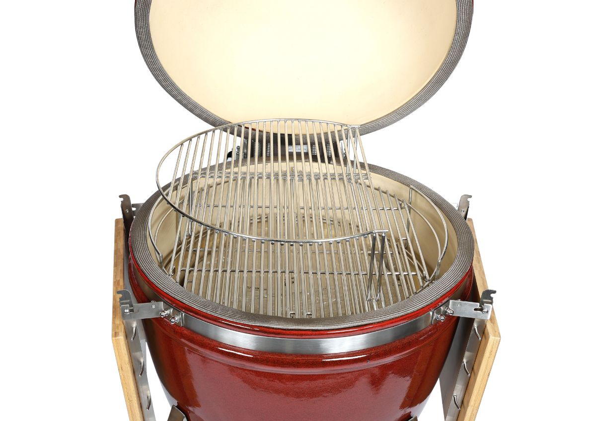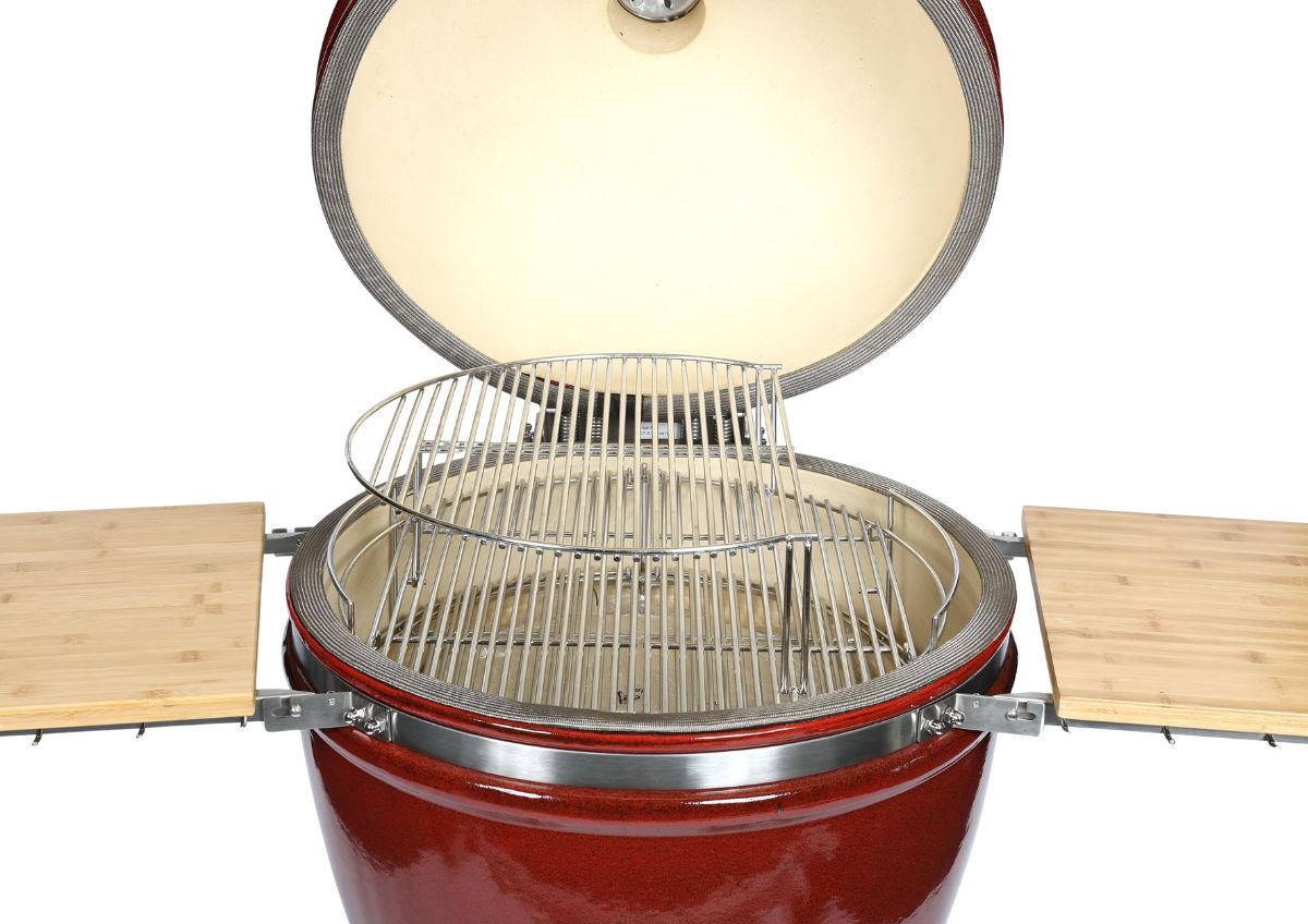 Perfekt zum Grillen, BBQ oder als Ofen. Heizt bis zu 400 °C. Die 3 cm dicke Keramikwand und die Dichtung mit Metallfasern sowie der hitzebeständige Kamin sorgen für herausragende Leistung und Wärmespeicherung. Ausgestattet mit zweistufigem Rostsystem und praktischem Erhöhungsrost. Ein geteilter Kohlekorb sorgt für optimale Luftzirkulation.